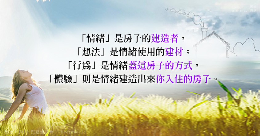「情緒」是房子的建造者,「想法」是情緒使用的建材;「行為」是情緒蓋這房子的方式,「體驗」則是情緒建造出來你入住的房子。