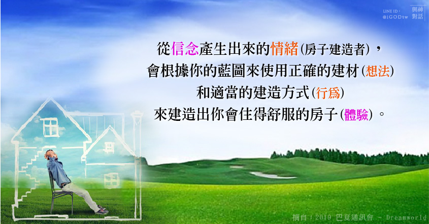 現在,從信念產生出來而為了強化它自身真實性的「情緒」(建造者),會根據你的藍圖來使用正確的建材(想法)、適當的建造方式(行為)來建造出你會住得舒服的房子(體驗)。