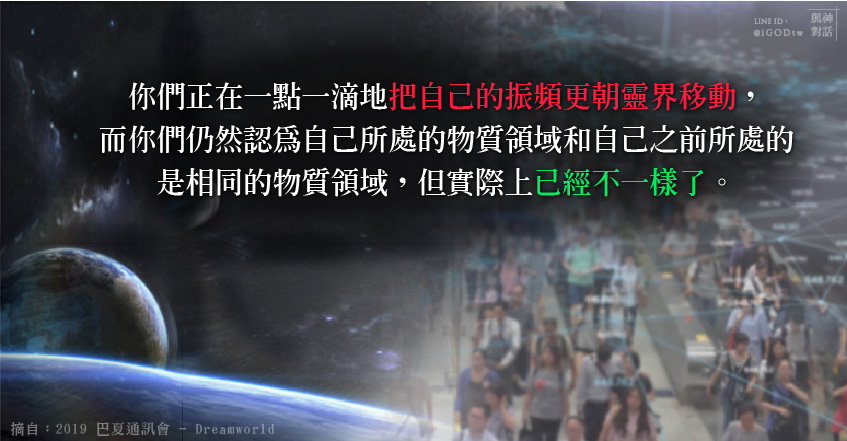 你們正在一點一滴地把自己的振頻更朝靈界移動,(而你們)仍然認為自己所處的物質領域和自己之前所處的是相同的物質領域,但實際上已經不一樣了。