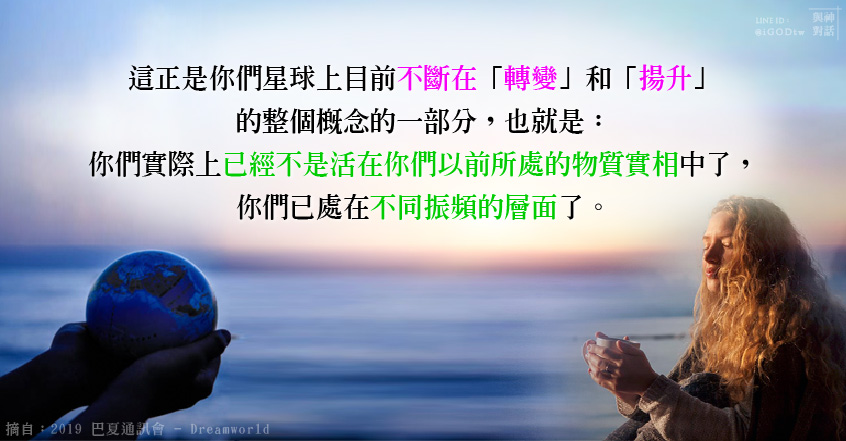 像這樣地,這正是你們星球上目前不斷在「轉變」和「揚升」的整個概念的一部分,也就是:你們實際上已經不是活在你們以前所處的物質實相中了,你們已處在不同振頻的層面了。