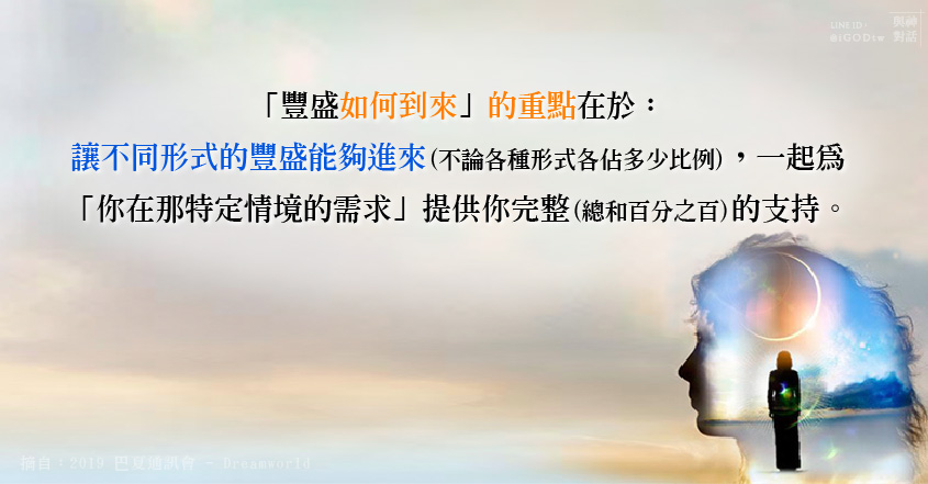 而你頓時領悟「豐盛如何到來」的重點在於:讓不同形式的豐盛,不管每種形式各佔多少比例,能夠進來一起運作為「你在那特定情境的需求」提供你完整(總和百分之百)的支持。