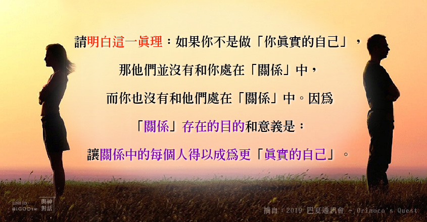 但請明白這實情(真理):如果你不是你真實的自己」,那他們並沒有和你處在「關係」中,而你也沒有和他們處在「關係」中,不論以何種方式。(因為「關係」存在的目的和意義是:讓關係中的每個人得以成為更「真實的自己」。)