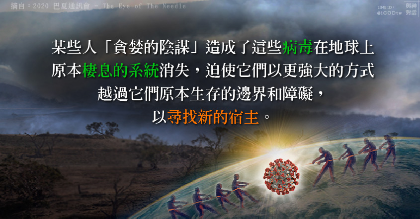 但是(某些人)「貪婪的陰謀」造成了這些病毒在地球上原本棲息系統的消失,迫使它們以更強大的方式越過它們原本生存的邊界和障礙,以尋找新的宿主。