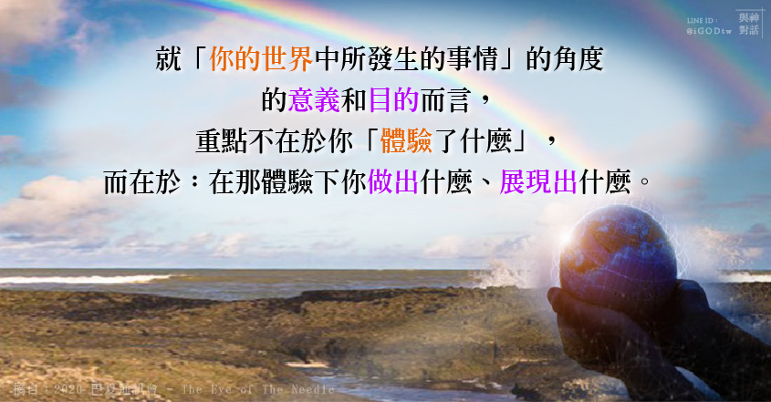 因為如同我們已經說過很多次的:就「你的世界中所發生的事情」的角度(的意義和目的)而言,重點不在於你「體驗了什麼」,而是「在那體驗下你做出了什麼」(即:重點的核心不在那情境和體驗,而是你在那情境中你所做出、所展現的思言行)。