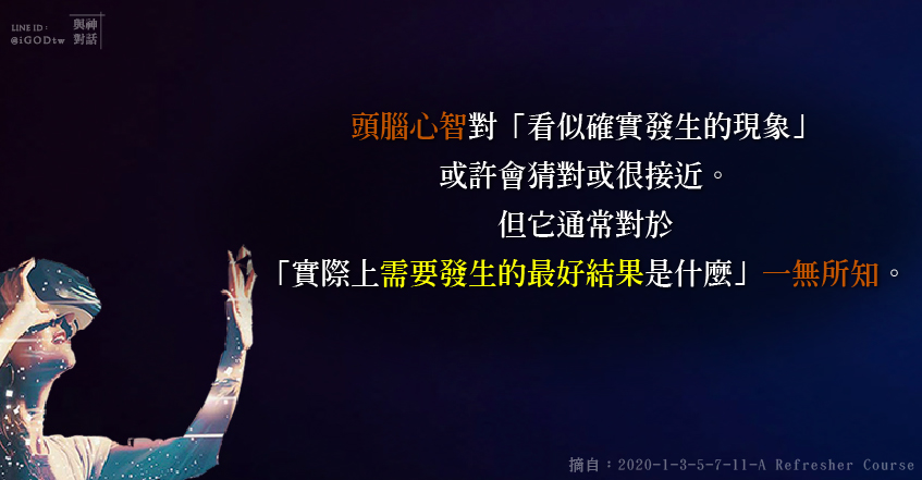 因為這(從較高心智角度觀看的完整畫面下)運作的真相是:你們的物質心智(頭腦)對「看似確實發生的現象」有時候或許會猜對、猜得很接近,或猜得很近似,