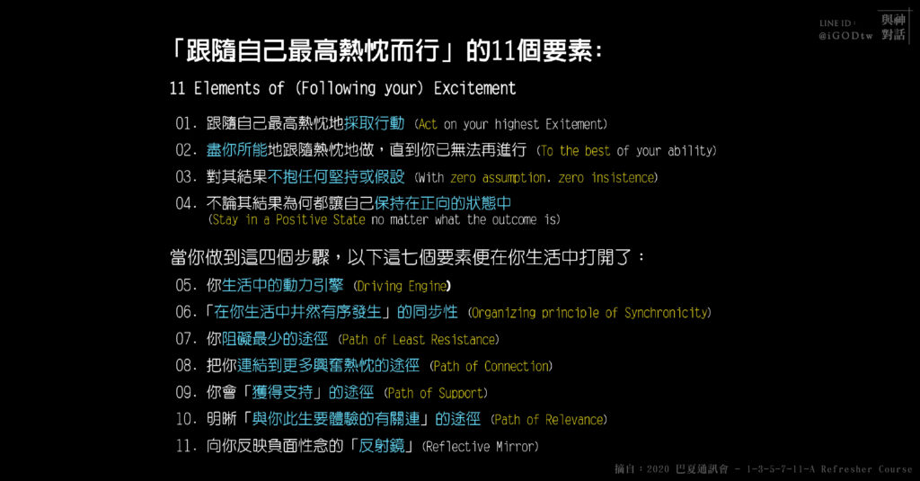 你就會是在實現「11個跟隨自己最高熱忱而行的要素」,那會自動地帶領你進入「實現你的人生(滿足你人生願望)」的道路。