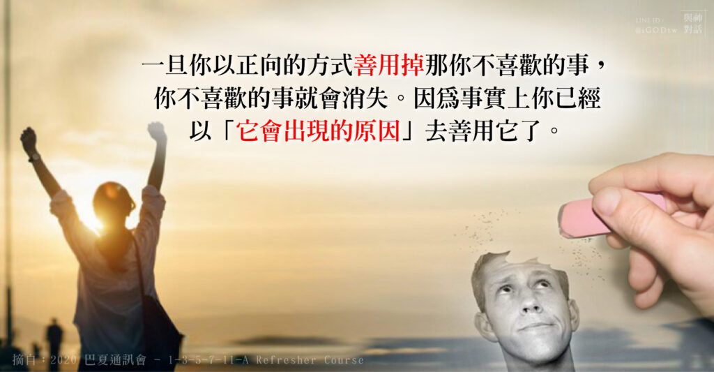 一旦你以正向的方式善用掉那你不喜歡的事,它就會消失。因為你事實上已經以它會出現的原因去善用它了。