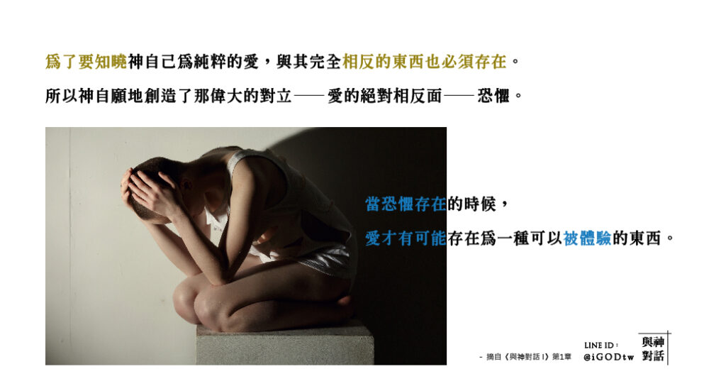 神知道愛的存在——並且為了要知曉祂自己為純粹的愛,與其完全相反的東西也必須存在。所以神自願地創造了那偉大的對立——愛的絕對相反面——每樣不是愛的東西,現在被稱為恐懼的東西。當恐懼存在的時候,愛才有可能存在為一種能夠被體驗的東西。