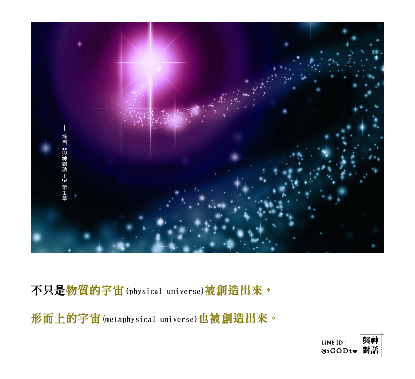 換言之,不只是物質的宇宙(physical universe)被這樣地創造出來,形而上的宇宙(metaphysical universe)也一樣被創造出來。神形成出「是/不是」對等式之另一半(the second half of the Am/Not Am equation)的那部分,也爆炸成比整體小的無限數量的能量單位。這些能量單位你們稱為「靈」(spirit)。