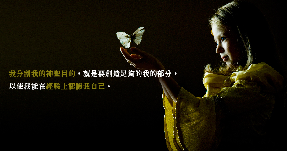 我分割我的神聖目的,就是要創造足夠的我的部分,以使我能在經驗上認識我自己(know Myself experientially)。