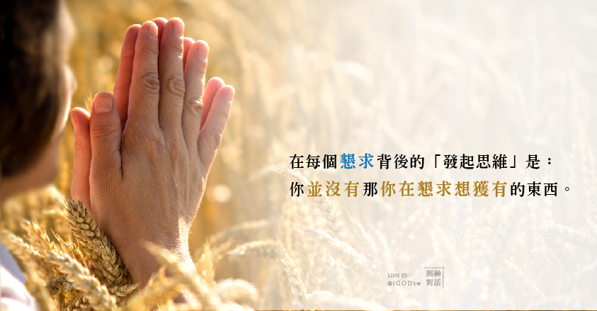 因此,如果你以乞求和哀告(beg and supplicate)的態度做祈禱,你會「經驗到你所選擇的事物」的機會似乎就小得多,因為在每個懇求背後的「發起思維」是:你目前並沒有那你希望獲有的東西(the Sponsoring Thought behind every supplication is that you do not have now what you wish)。那個「發起思維」變成了你的實相 (reality)。