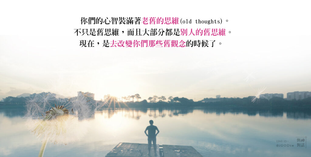 你們的心智目前充滿了舊思想。不只是舊思想,而且大部分都是別人的舊思想。這點現在很重要,現在是「去改變你對於某件事的想法」的時候了。這就是「進化、演化」的整個意思和重點。(This is what evolution is all about.)
