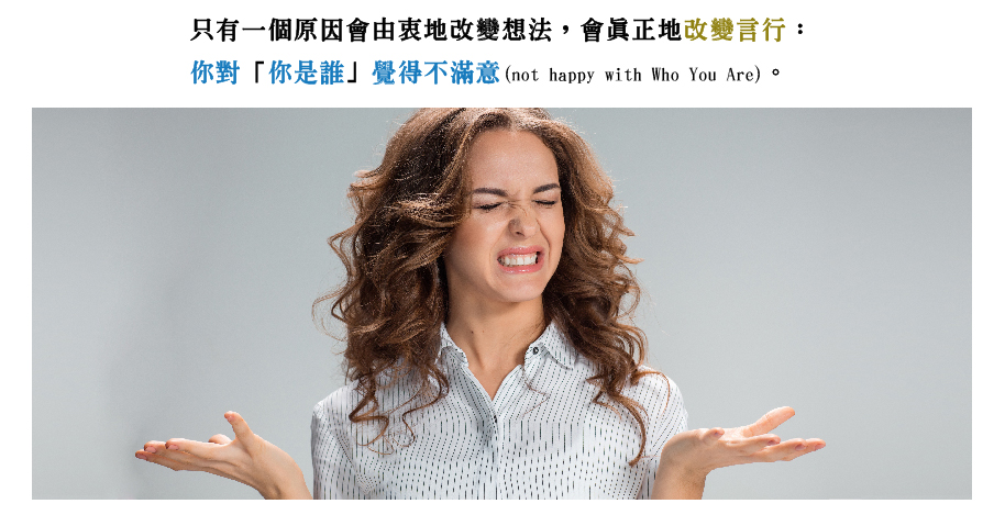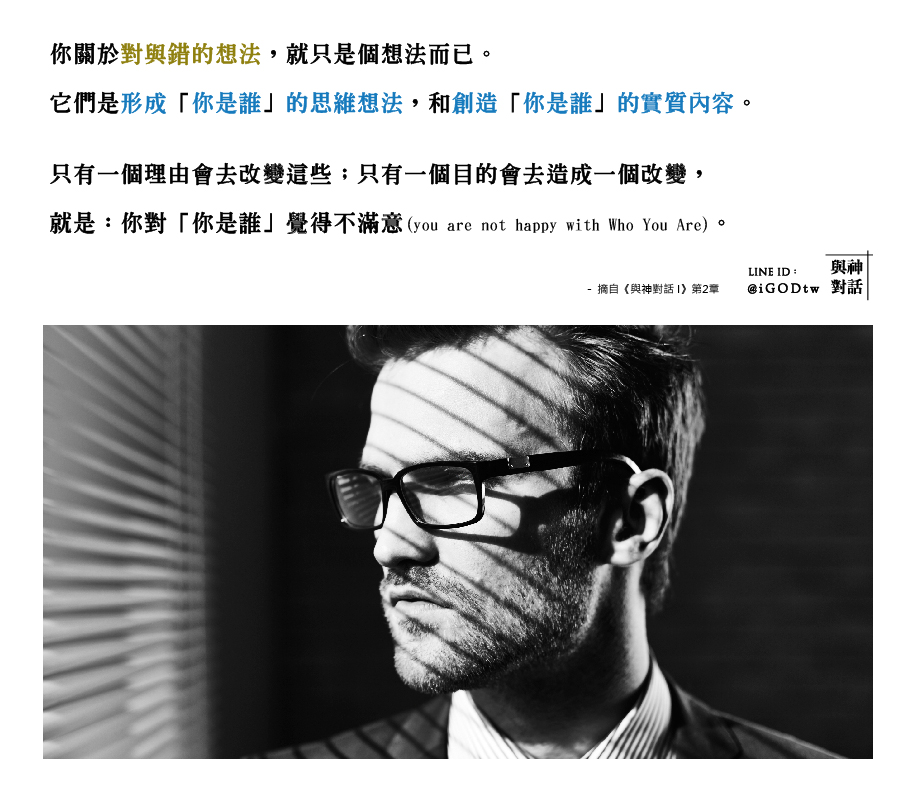 你關於對與錯的想法,就只是個想法而已。它們是形成「你是誰」的思維想法,和創造「你是誰」的實質內容(They are the thoughts which form the shape and create the substance of Who You Are.)。只有一個原因會去改變這些;只有一個目的會去造成一個改變,就是:如果你對「你是誰」覺得不滿意(There would be only one reason to change any of these; only one purpose in making an alteration: if you are not happy with Who You Are)。