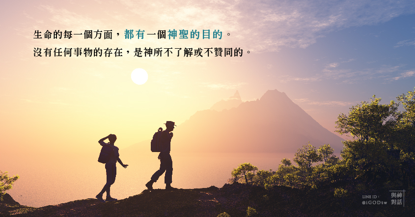 我即生命,因為我是「生命所是的東西」(I am life, for I am the stuff life is.)。生命的每一個方面,都有一個神聖的目的。沒有一樣東西——沒有任何一樣——的存在,是沒有一個為神所了解及贊同的理由的。(Its every aspect has a divine purpose. Nothing exist—nothing—without a reason understood and approved by God.)