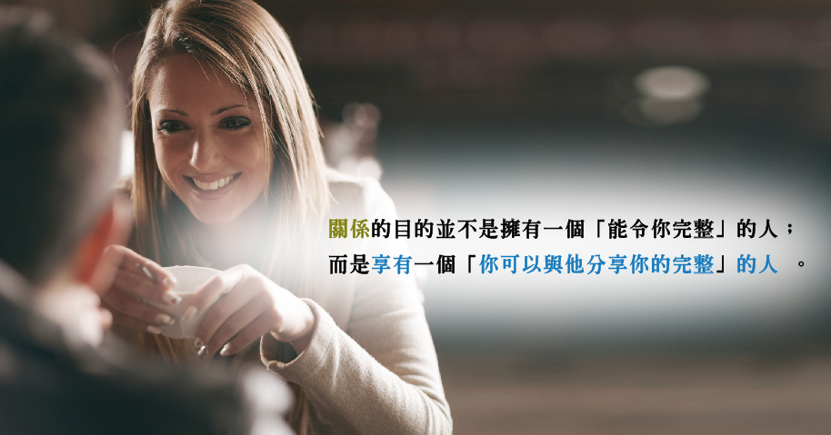 關係的目的並不是擁有一個「能令你完整」的人;而是享有一個「你可以與他分享你的完整」的人(The purpose of relationship is not to have another who might complete you; but to have another with whom you might share your completeness.)。