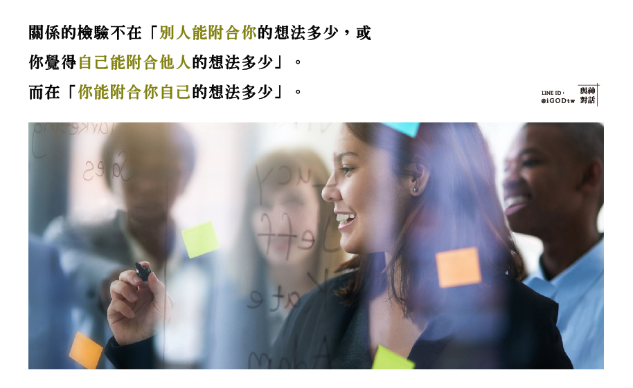 你們對關係的測試考驗始終在於「別人能附合你的想法多少,以及你覺得自己能附合他人的想法多少」。然而,真正的考驗卻只在於「你能附合你更高自己的想法」有多少(the only true test has to do with how well you live up to yours)。