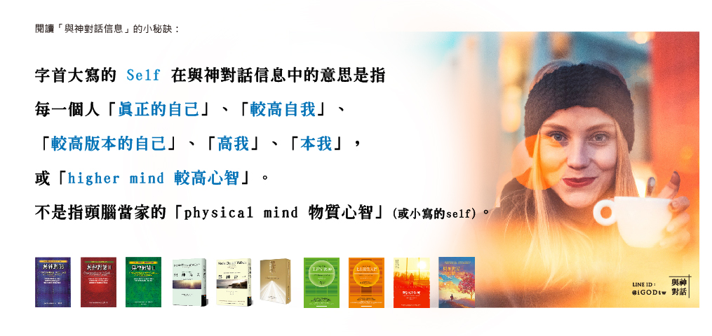 (*註:字首大寫的 Self 在與神對話信息中的意思是指「真正的自己」、「較高自我」、「較高版本的自己」、「高我」、「本我」,或「higher mind 較高心智」。不是指頭腦當家的「physical mind 物質心智」或小寫的 self。)