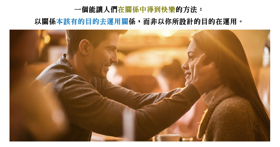 的確是有一個「能讓人們在關係中得到快樂」的方法,那就是,以它們(關係)本該有的目的去運用關係(use relationships for their intended purpose),而非以你所設計的目的在運用。