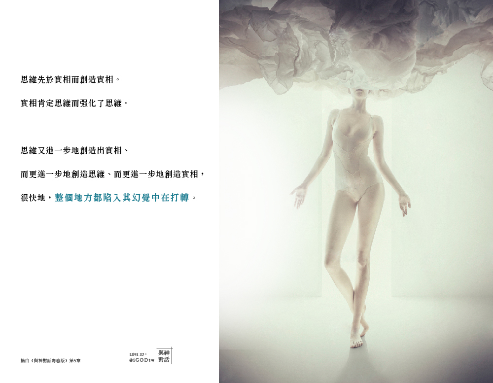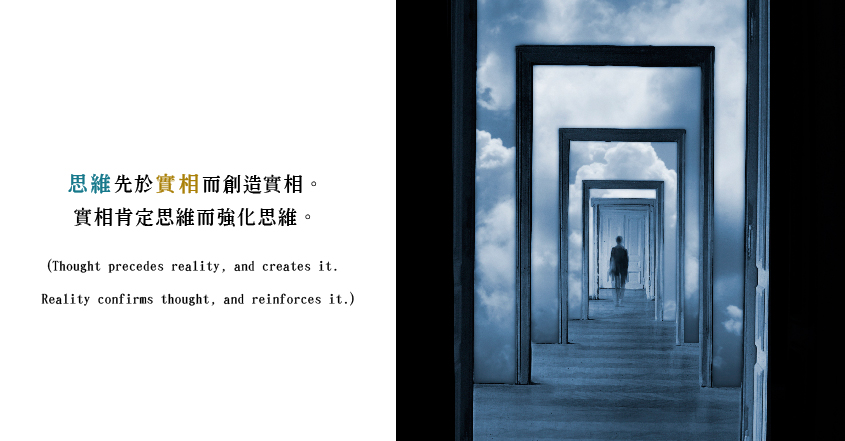 這個「實相」進一步肯定了那原始思維,惡性循環於是被創造出來了。思維(想法)先於實相而創造實相。實相肯定思維而强化該思維(模式) (Thought precedes reality, and creates it. Reality confirms thought, and reinforces it.)。該思維又進一步地創造出該實相形態、而更進一步地創造該思維模式、而又更進一步地創造該實相形態,很快地,整個地方都陷入其幻覺中在打轉。在「愛麗絲漫游仙境」的世界裡,每個人會發誓說什麼是真實的並非真實,而什麼並非真實卻是真實的。