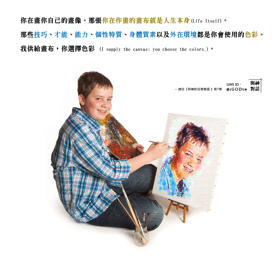 這麽想它吧,在每個當下的片刻你都在重新創造你自己。你在畫你自己的畫像。那張你在作畫的畫布就是人生本身(Life Itself)。那些技巧、才能、能力、個性特質、身體質素以及外在環境都是你會使用的色彩。我供給畫布,你選擇色彩 (I supply the canvas; you choose the colors.)。
