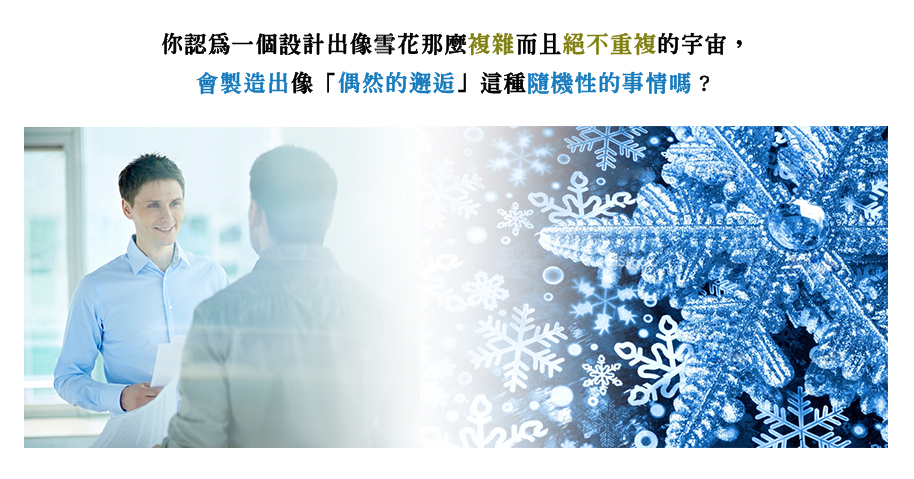 沒有。你認爲一個設計出像雪花那麽複雜而且絕不重複的宇宙,會製造出像「偶然的邂逅」這種隨機性的事情嗎?