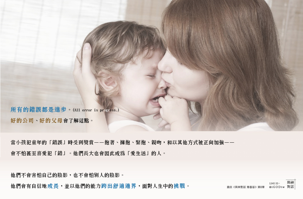 當小孩犯童年的「錯誤」時受到獎賞——抱著、擁抱、緊抱、親吻,和以其他方式被正向加强——會不怕甚至喜愛犯「錯」。他們長大也會因此成為「愛生活」的人。
