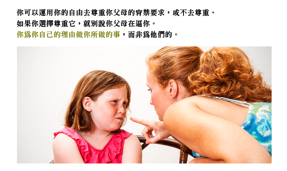 我是說,你可以運用你的自由去尊重你父母的宵禁要求,或不去尊重。如果你選擇尊重它,就別說你父母在逼你。你爲你自己的理由做你所做的事,而非為他們的。