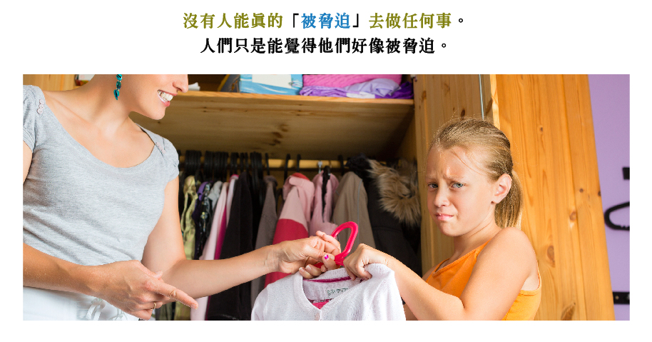沒有人能「被脅迫」去做任何事。他們只是能覺得他們好像被脅迫。 (Nobody can be “coerced” to do anything. They can only feel as if they are.)