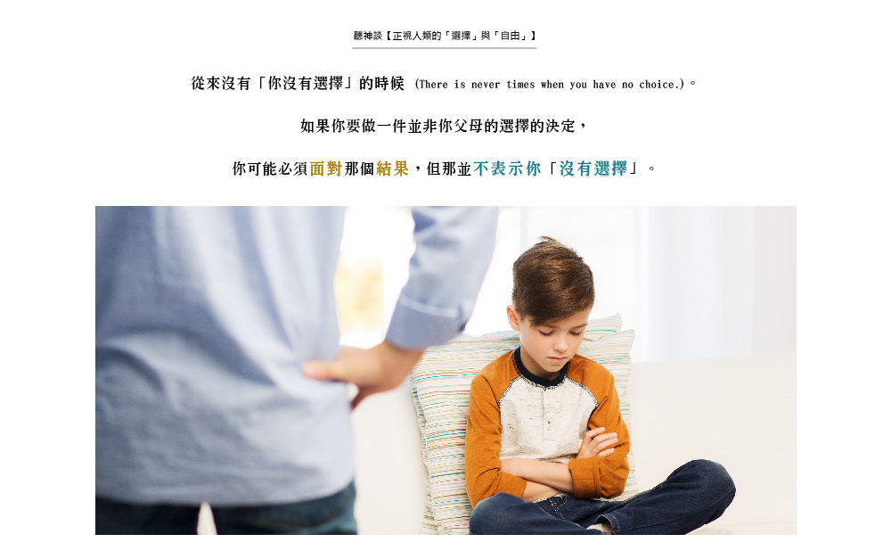 從來沒有「你沒有選擇」的時候 (There is never times when you have no choice.)。那是我正在告訴你們的。如果你要做一件並非你父母的選擇的決定,你可能必須面對特定的結果,但那並不表示你「沒有選擇」。