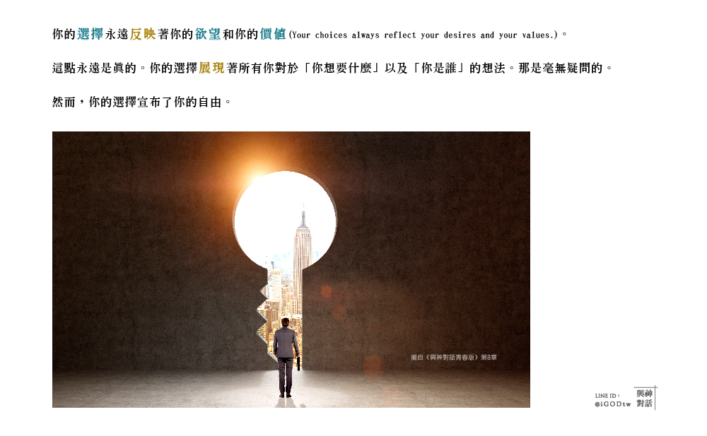你的選擇永遠反映著你的欲望和你的價值(Your choices always reflect your desires and your values.)。這點永遠是真的。你的選擇展現著所有你對於「你想要什麽」以及「你是誰」的想法。那是毫無疑問的。然而,你的選擇並沒有宣布你沒有任何自由,却正好相反。