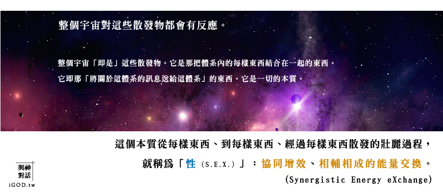 這個本質從每樣東西、到每樣東西、經過每樣東西散發的壯麗過程,就稱爲「性(S.E.X.)」或即……協同增效的能量交換(Synergistic Energy Exchange或,相輔相成的能量交換)。