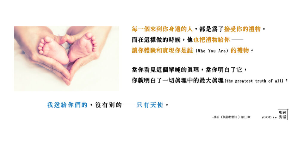 我告訴你:每一個來到你身邊的人,都是為了接受你的禮物。而在這樣做的時候,他也把禮物給你——讓你體驗和實現你是誰(Who You Are)的禮物。