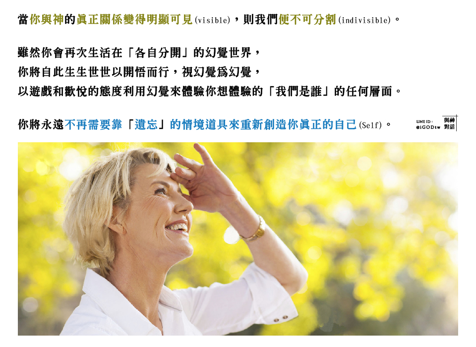 你將永遠不再需要靠「遺忘」的情境道具(device of forgetfulness)來重新創造你真正的自己(Self),卻只是為某一個理由、某一個目的,而有意識地運用「各自分開」的幻覺,而選擇顯化一切為各自分開的。