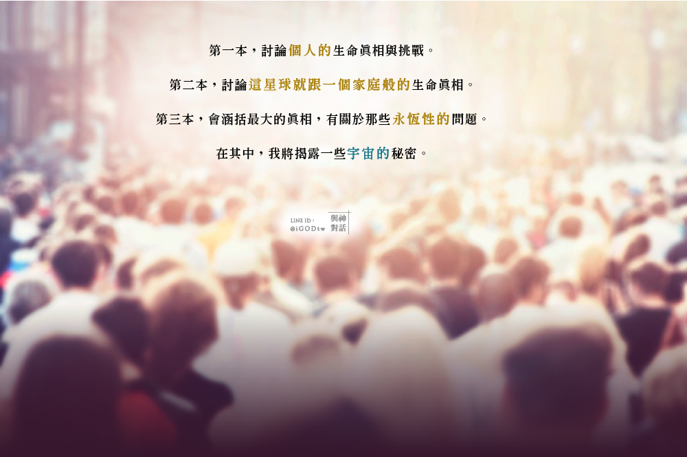 我跟你說過,我從開始就答應過你。我說,我們會有三本書。第一本,討論個人的生命真相與挑戰(individual life truths and challenges)。第二本,討論這星球就跟一個家庭般的生命真相(truths of life as a family on this planet)。第三本,我說過,會涵括最大的真相,有關於那些永恆性的問題(the largest truths, having to do with the eternal questions)。在其中,我將揭露一些宇宙的秘密。