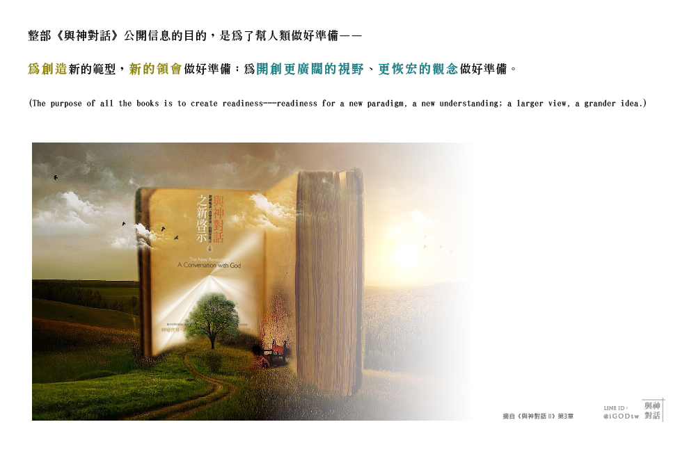 這本書的目的,以及我們所創造的這三部曲的每一部的目的,都是為了做好準備——為創造新的範型,新的領會做好準備;為開創更廣闊的視野、更恢宏的觀念做好準備。 (The purpose of this book, and of all the books in the trilogy we are creating, is to create readiness—readiness for a new paradigm, a new understanding; a larger view, a grander idea.)