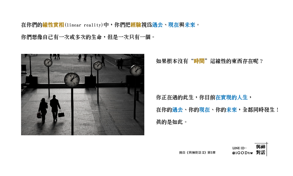 你正在過的此生,你目前在實現的人生,在你的過去、你的現在、你的未來,全都同時發生! (You are living this life, your presently realized life, in your Past, your Present, your Future, all at once!)