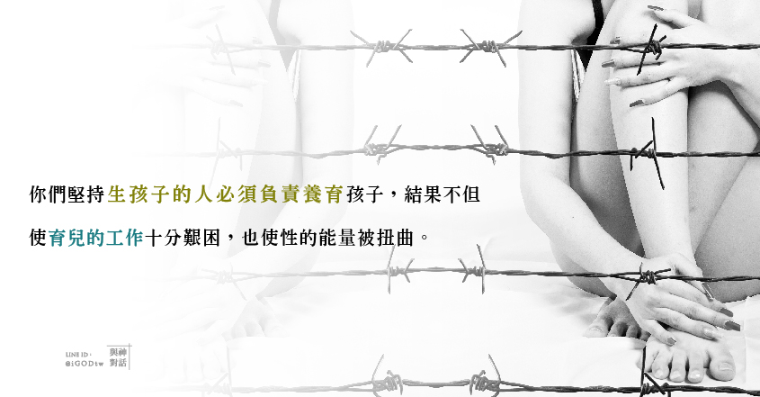 但在你們的社會,你們卻堅持生孩子的人必須負責養育孩子——結果是,你們不但使得做父母的育兒工作十分艱困,也把許多環繞著性行為(sexual act)的能量給扭曲了。