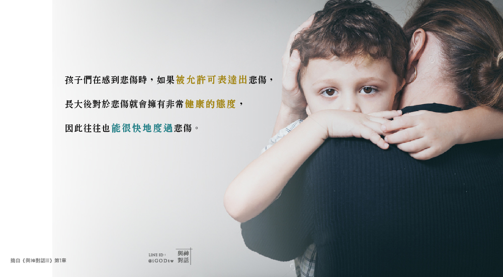 當你的悲傷被允許表達出來時,你就擺脫掉它。孩子們在感到悲傷時,如果被允許可表達出悲傷,長大後對於悲傷就會擁有非常健康的態度,因此往往也能很快地度過悲傷。
