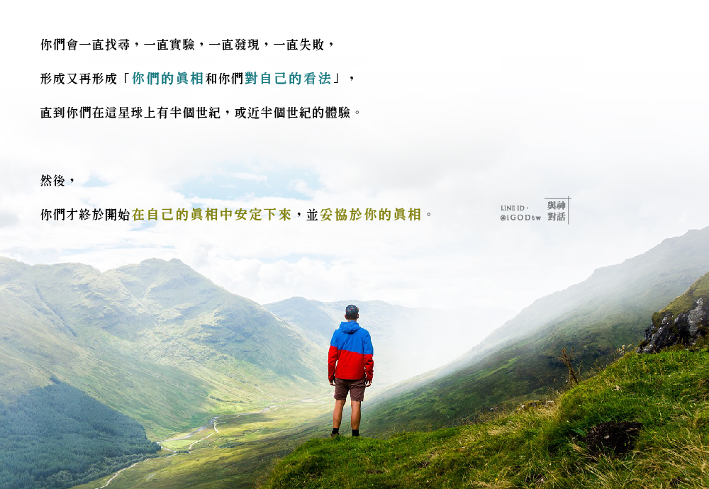 而你們會一直找尋,一直實驗,一直發現,一直失敗,形成又再形成「你們的真相(your truth 你們認為的真理)和你們對自己的看法」,直到你們在這星球上有半個世紀,或近半個世紀的體驗。