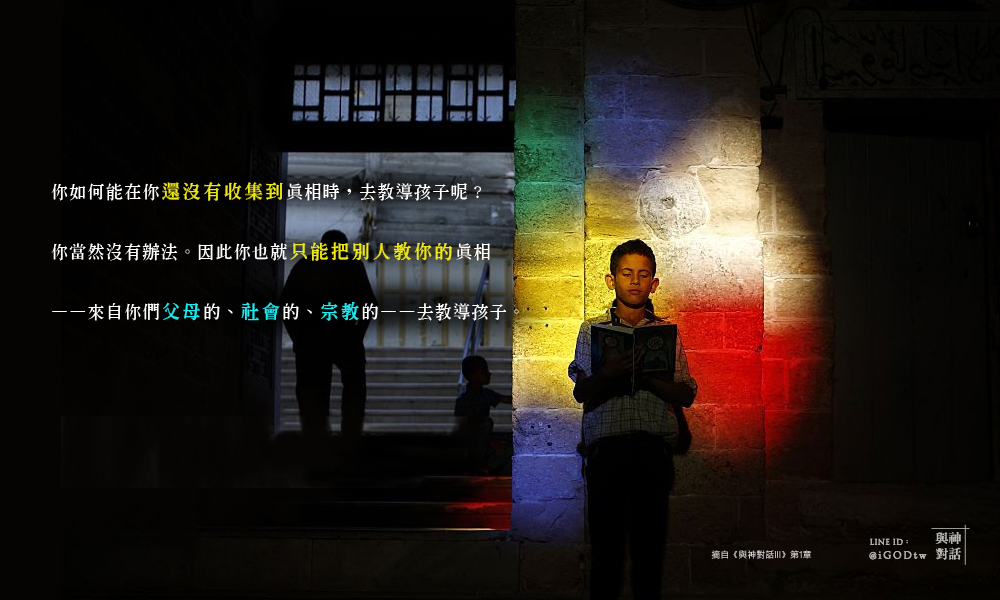 你當然沒有辦法。因此你們也就只能把別人教你們的真相去教導孩子。任何事情、所有事情的真相,只是沒有你自己的。因為你們自己還在找尋那些真相。