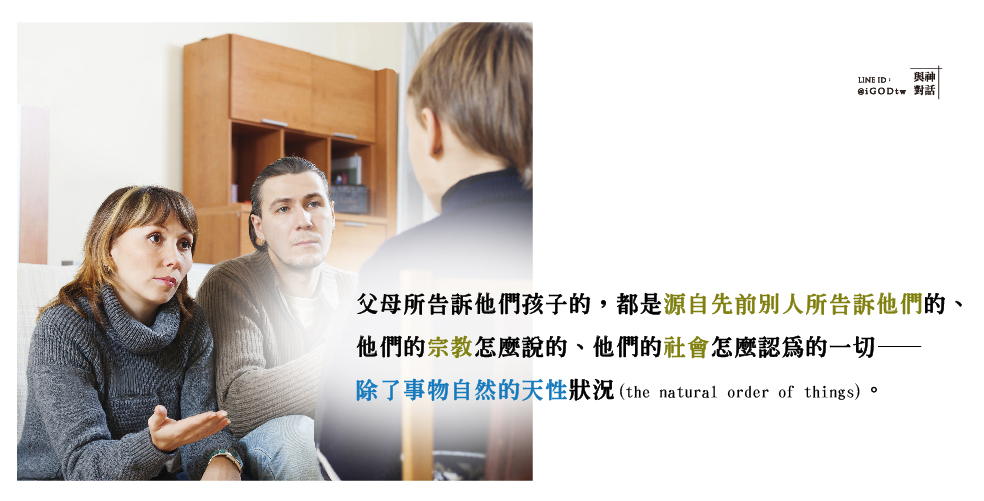 有關人性的這一部分,從觀察得知,在各方面許多父母所告訴他們孩子的,都是源自先前別人所告訴他們的、他們的宗教怎麼說的、他們的社會怎麼認為的一切——除了事物自然的天性狀況(the natural order of things)。