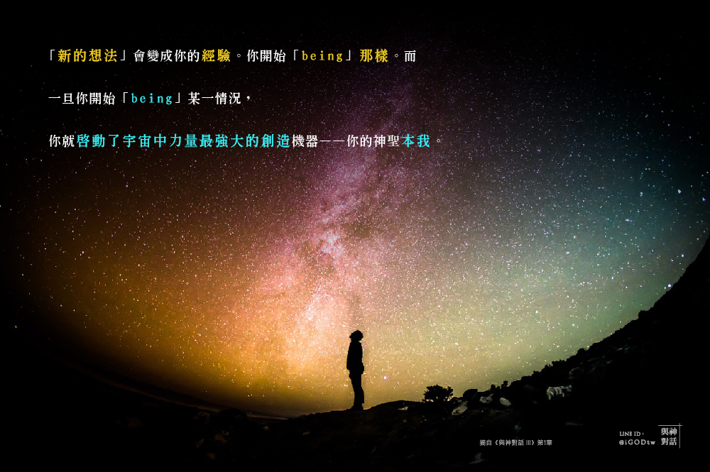 於是,這個「新的想法」就變成你的經驗。你開始「being」那樣。而一旦你開始「being」某一情況,你就啟動了宇宙中力量最強大的創造機器——也就是你的神聖本我(Once you start “being”a thing, you have engaged the gears of the most powerful creation machine in the universe—your Divine Self.)。