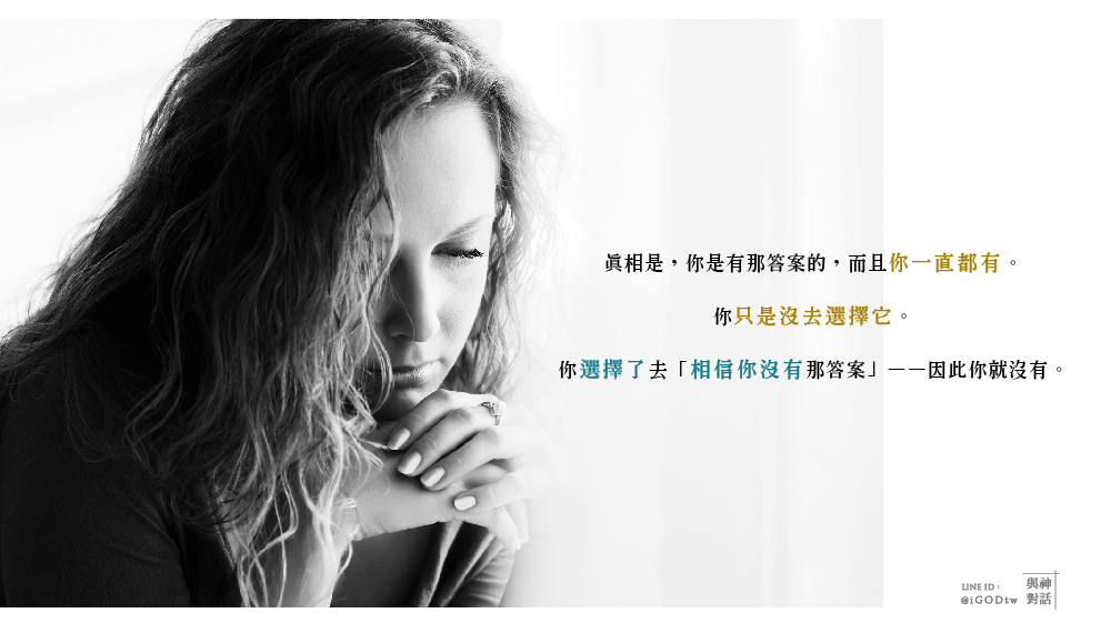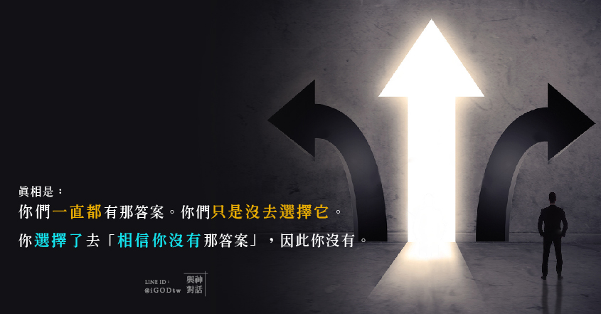 你說你想要答案,但你並沒有在選擇它(You say that you want the answer, but you are not choosing it.)。你知道你自己沒有選擇它,因為你並沒有「經驗到你有答案」。真相是,你是有那答案的,而且你一直都有。你只是沒去選擇它。你選擇了去「相信你沒有那答案」——因此你就沒有。