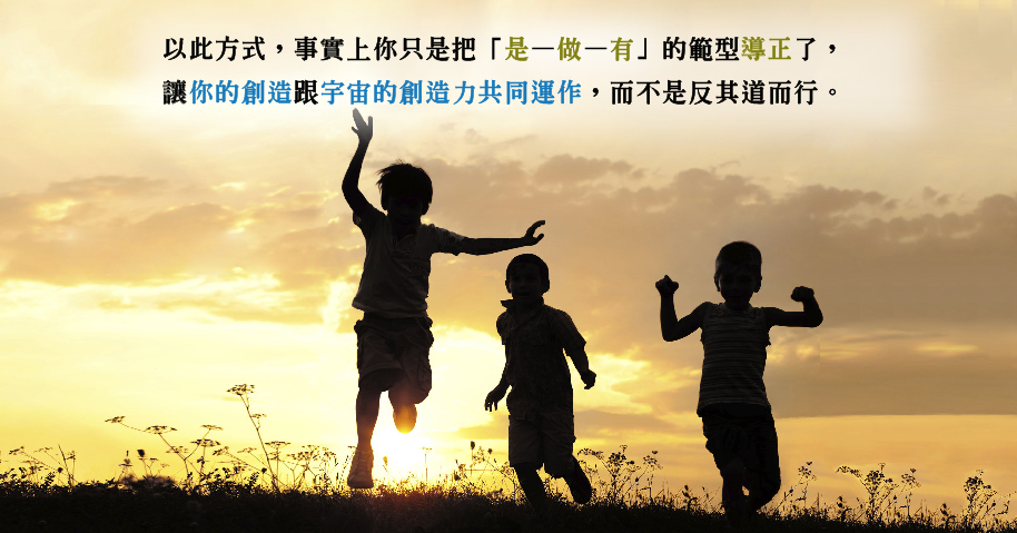 以此方式,你就把你已慣用的範型倒轉過來,事實上是把你「是—做—有」的範型導正了,讓它跟宇宙的創造力共同運作,而不是反其道而行。