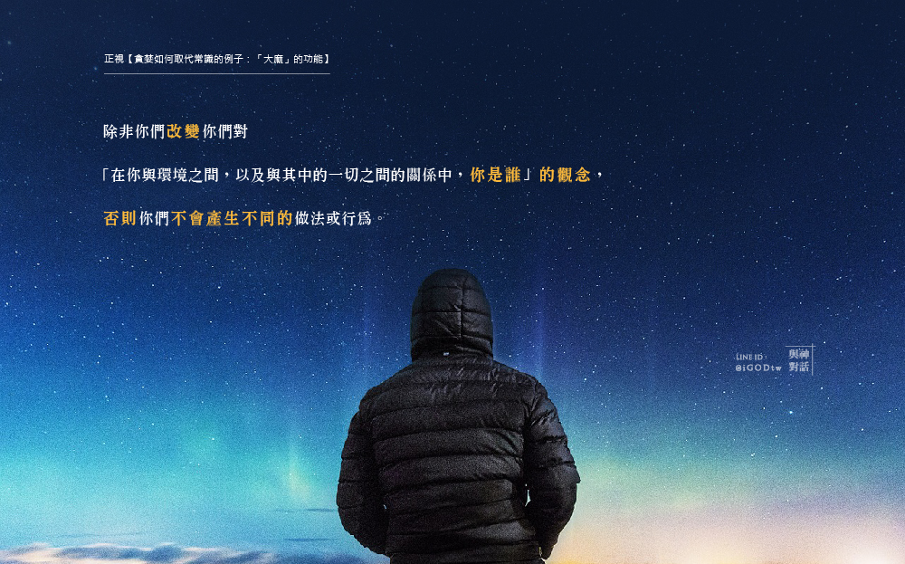 除非你們改變你們對「在你與環境之間,以及與其中的一切之間的關係中,你是誰」的觀念(change your idea about who you are in relationship to your environment and everything in it),否則你們不可能有不同的做法。