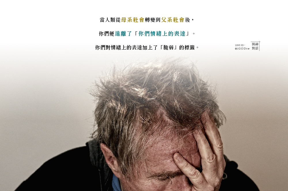 在人類歷史的早期,你們這星球上的社會是個母系社會。後來發生了轉變,產生了父系社會。當你們做了這項社會的重大轉變時,你們便遠離了「你們情緒上的表達」(moved away from expressing your emotions)。你們對情緒上的表達加上了「脆弱」的標籤。就是在這個階段,男人也發明了魔鬼(devil),和雄性的神(masculine God)。