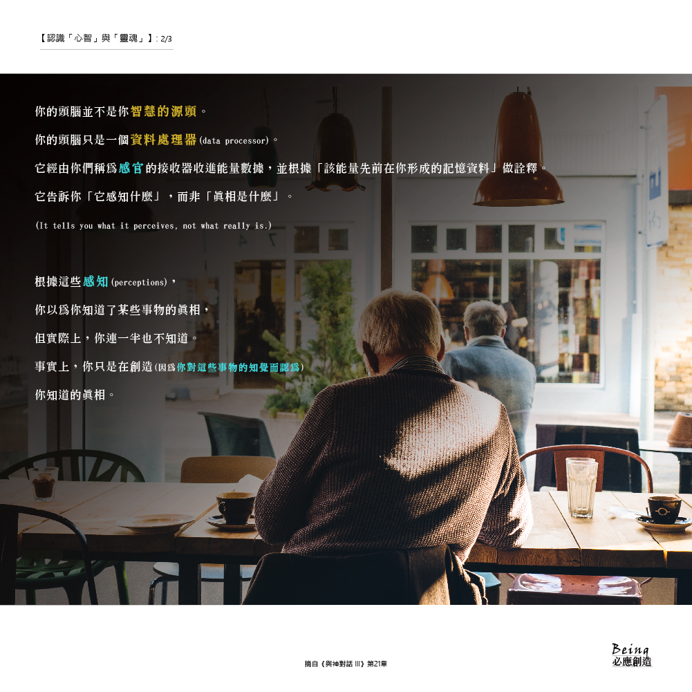 人類在地球上的演化已經到21世紀了,我們已長大,我們已無法不去正視真實的自己是「身心靈三面向」的真相。而在這更大的畫面下,心智只是一個〝資料處理器〞,它並非我們智慧的源頭。