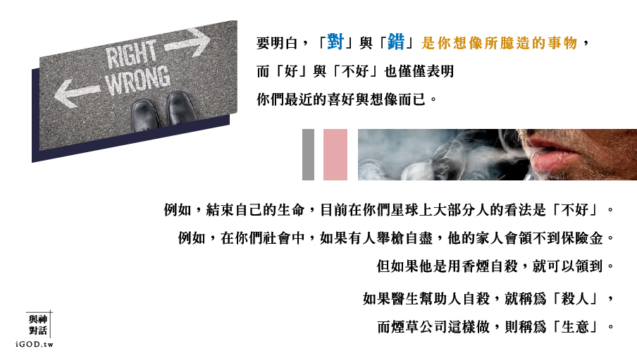 例如,結束自己的生命,目前在你們星球上大部分人的看法是「不好」。