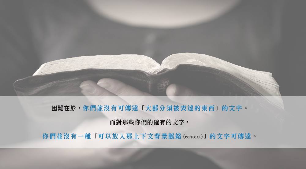 困難在於,你們並沒有可傳達「大部分須被表達的東西」的文字,而對那些你們的確有的文字,你們並沒有一種「可以放入那上下文背景脈絡 (context)的文字」可傳達。這即是許多靈性和秘傳著作的困難所在。它們都試圖以「提出和背景脈絡之外的有限文字」在傳達有關終極實相的真理。