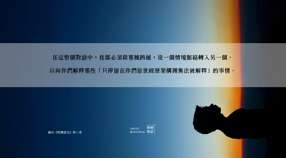 在這整個對話中,我都必須做那種跨越,從一個情境脈絡轉入另一個,以向你們解釋那些「只停留在你們俗世經歷架構裡無法被解釋」的事情。